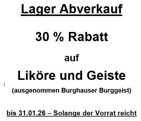 Wir brauchen Platz im Lager. Darum gibt es ab sofort, bis 31.01.26 und solange der Vorrat reicht, 30 % Rabatt auf Liköre und Geiste.